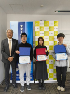 The certificates for the three awardees of the Poster Award from the poster session held at the POSCO Center in South Korea during FMfI2025 in August 2025 were presented by IMI Director Kenji Kajiwara.